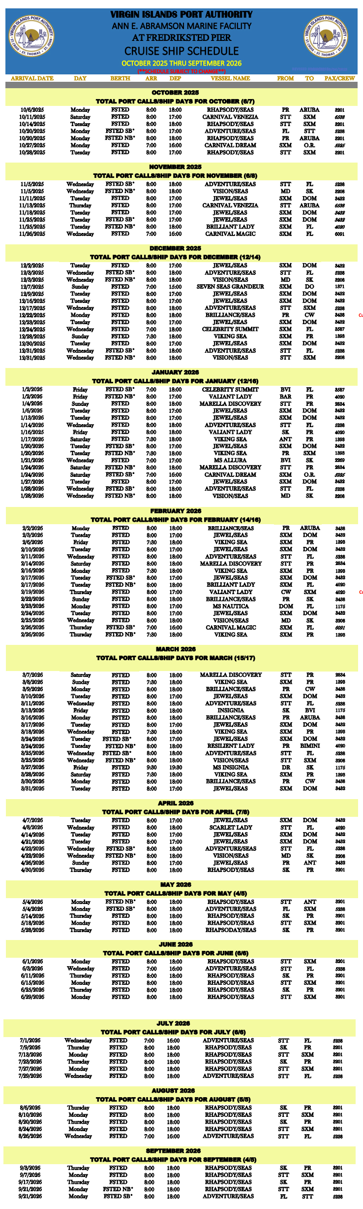 2025 - 2026 St. Croix Cruise Ship Schedule - Calendar - Arrivals